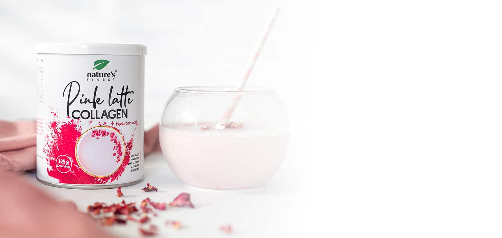 A large part of the results observed by our users when enjoying Pink latte collagen can be attributed to hyaluronic acid, which with its ability to bind water, increases the moisture in the skin.