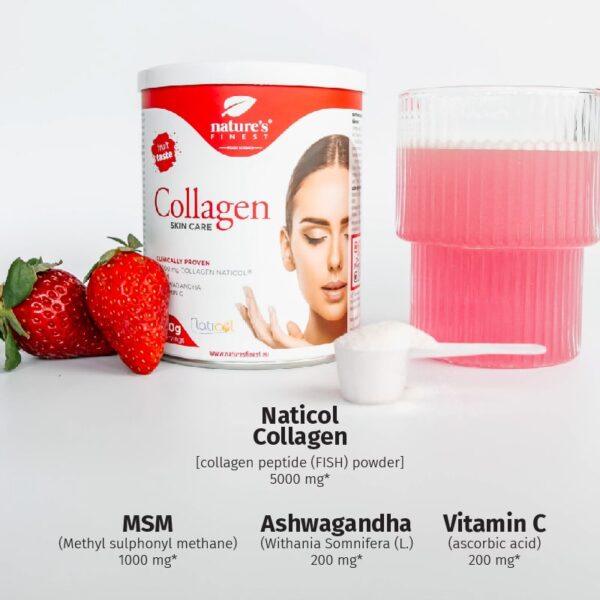 Ingredients: Naticol® hydrolysed fish collagen powder (50%), maltodextrin, MSM (methylsulfonylmethane), ashwagandha powder, natural strawberry flavour (2%), beetroot powder (1%), stabiliser: cellulose powder, vitamin C, steviol glycosides.