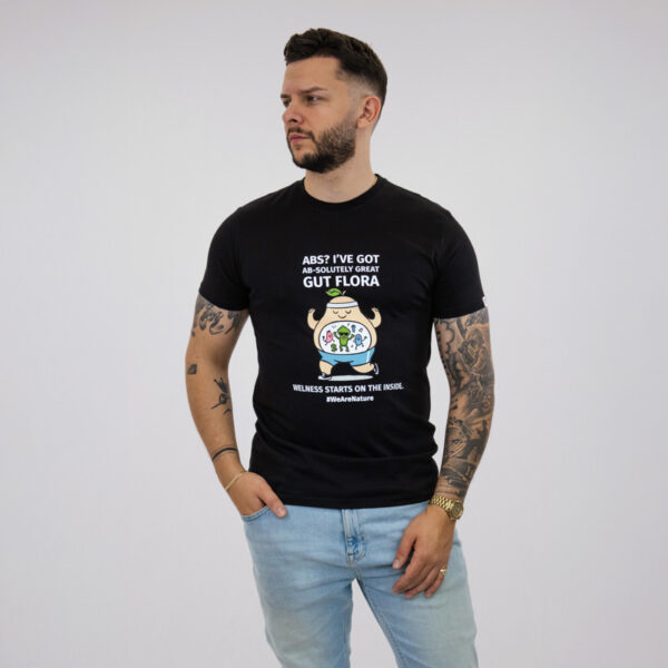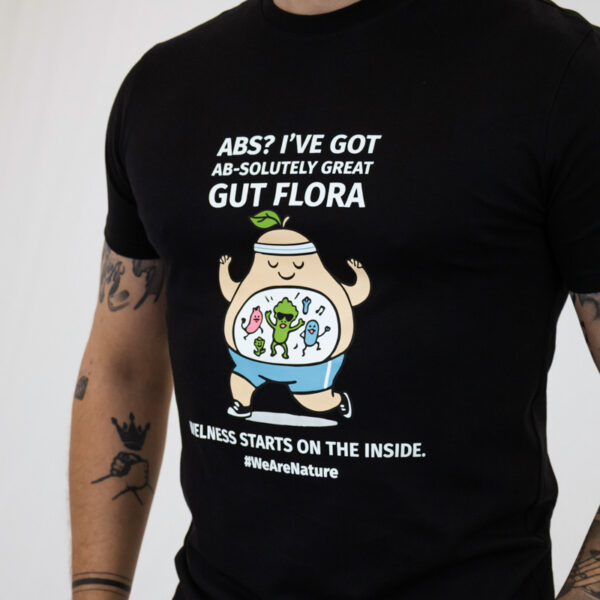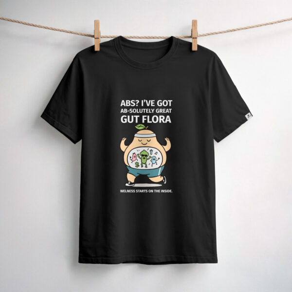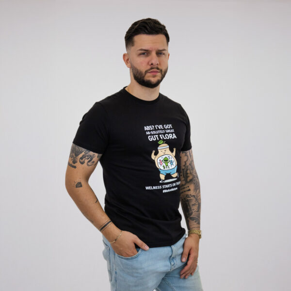 A fun and witty black T-shirt designed to bring humour to your everyday wardrobe. Featuring the playful statement “ABS? I’ve got AB-solutely great GUT FLORA,” it’s a light-hearted reminder that wellness starts from the inside.