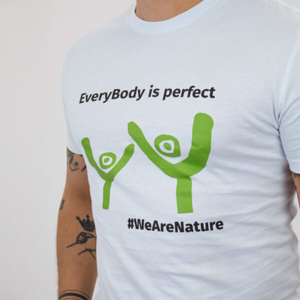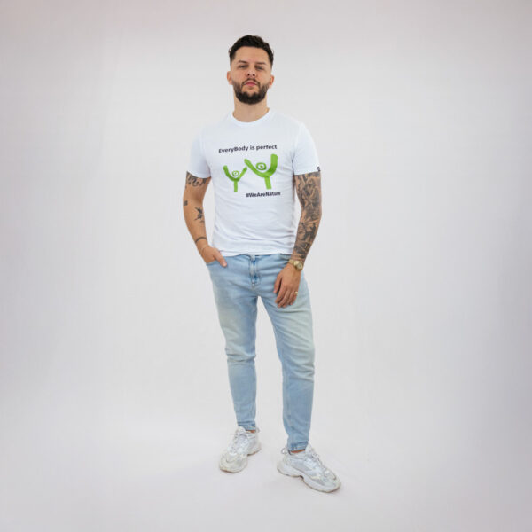A white T-shirt featuring a bold, minimalist graphic of two green figures with the message “EveryBody is perfect.” Designed for men who value confidence and authenticity, this tee combines style with a subtle statement about self-acceptance.