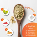 Ingredient: inulin powder, psyllium husk (Plantago ovata) powder, prickly pear (nopal) stem extract 10:1 (Opuntia ficus-indica), green tea (Camellia sinensis (L.) Kuntze, leaf) extract, cherry flavour, lemon flavour, stabiliser: cellulose, guarana (Paullinia cupana Kunth, seed) extract, ginger (zingiber officinale, root) powder, red beet concentrate (maltodextrin, red beet powder (Beta vulgaris)), Rebersa® Hydrochloride (Berberis aristata extract) of which 97% berberine chloride, sweetener: steviol glycosides from stevia, chromium picolinate. Contains naturally occurring sugars.