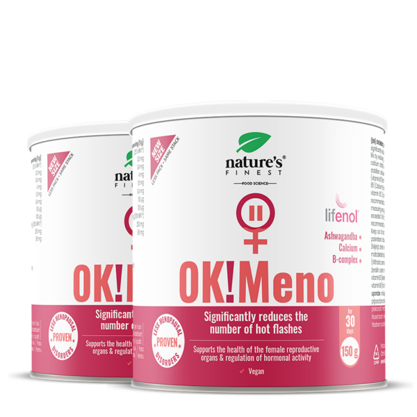 OK!Meno contains the patented plant extract Lifenol® that improves the quality of life in menopausal women within 6 weeks by significantly reducing hot flashes and night sweats¹*. Combined with ashwagandha that supports in periods of mental and nervous tension and of anxiousness², it provides comprehensive support.