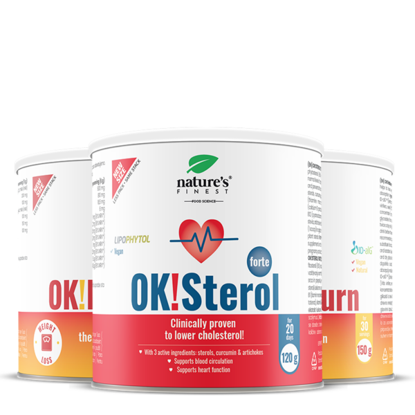 OK!Sterol Forte: Stir 1 scoop (3 g) twice a day into a glass of water. The beneficial effect is achieved with a daily intake of at least 800 mg of plant sterols.