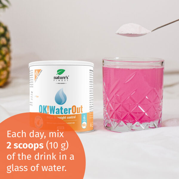 Every day, dose 2 scoops (10 g) of OK!WaterOut into a glass of water. With one scoop you will consume 50mg of knotweed, 100 mg of nettle extract and 100 mg of elderberry extract.