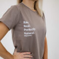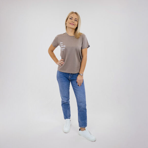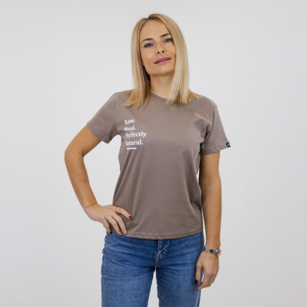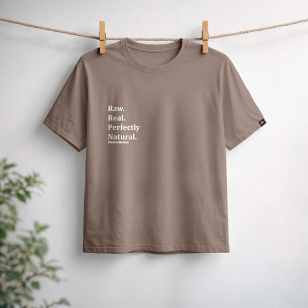 A minimalist brown T-shirt designed for effortless everyday style. Featuring the statement “Raw. Real. Perfectly. Natural.” in a clean white print, it combines comfort with an authentic, confident attitude.